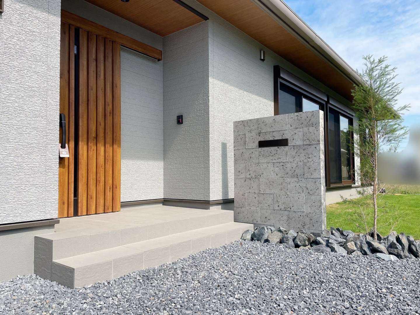 大谷石風タイル門柱が雰囲気をぐっとあげ、割栗石や緑との相性抜群です!